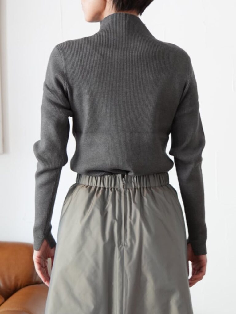 中央の編み地の切り替えや、袖口のミニスリットがポイントになります。
